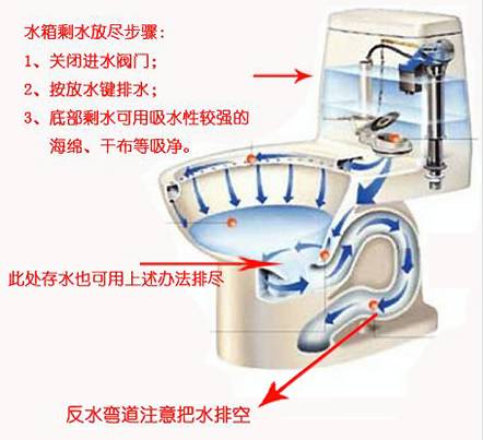 1、在冬季,为防止由于结冰,请在马桶不用时放尽剩水。放尽的方法和步骤如下:关闭进水阀门,旋松后取下排水螺栓,剩水放尽后旋紧排水螺栓,否则会造成漏水。马桶反水弯处会有积水,可用海绵抹布、抽水泵将积水吸出,以免马桶长期不用结冰冻裂。